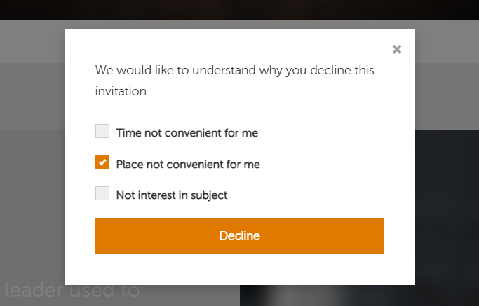 We have updated the "Decline" pop-up window by adding options that allow users to select the reason why they won’t attend the event. Each selected reason will result in a new association being created between contact and event (see more about associations).