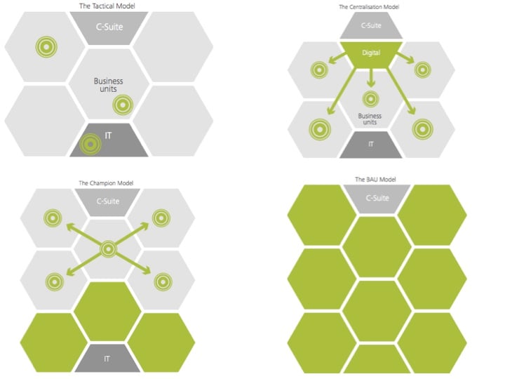 Most companies will recognise themselves in the ‘centralised’ and ‘champions’ model, though the fully prepared companies will behave like the ‘business as usual’ (BAU) model, where “business is flexible and responsive to change at all levels” and teams “form and disband dynamically according to business needs”.