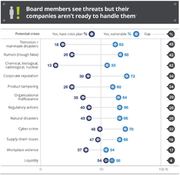 - Damage to corporate reputation ranked top area of vulnerability, followed closely by cyber-crime: Survey participants said the crisis areas that make them feel the most vulnerable are corporate reputation (73 percent) and cyber-crime (70 percent). Two-thirds (66 percent) named supply chain issues, regulatory action, and natural disasters as vulnerabilities as well.