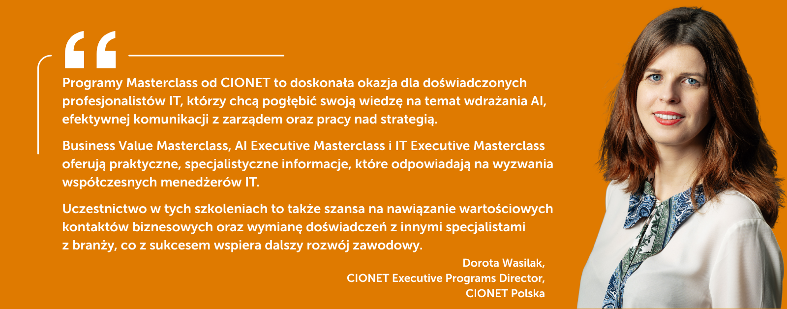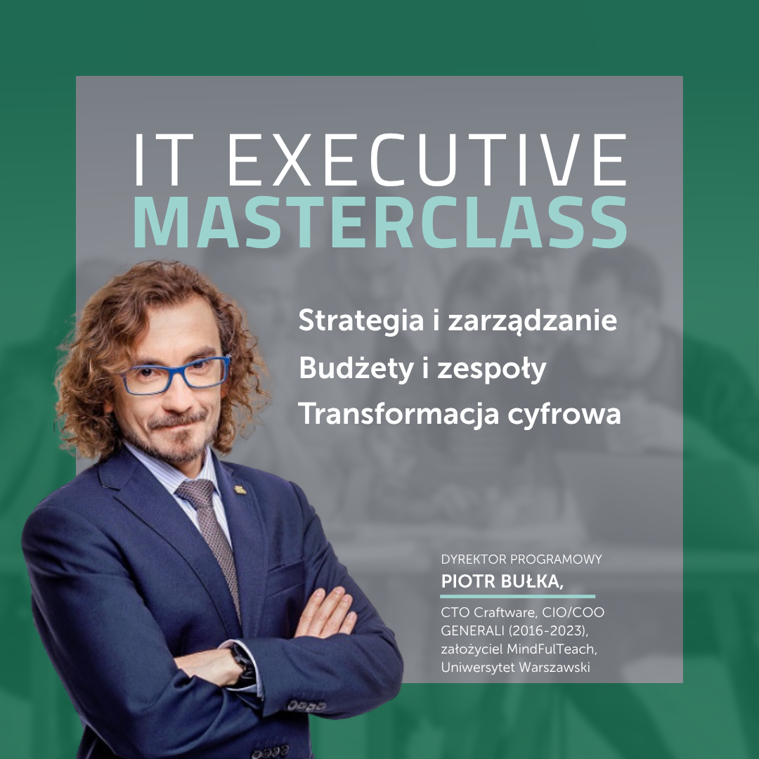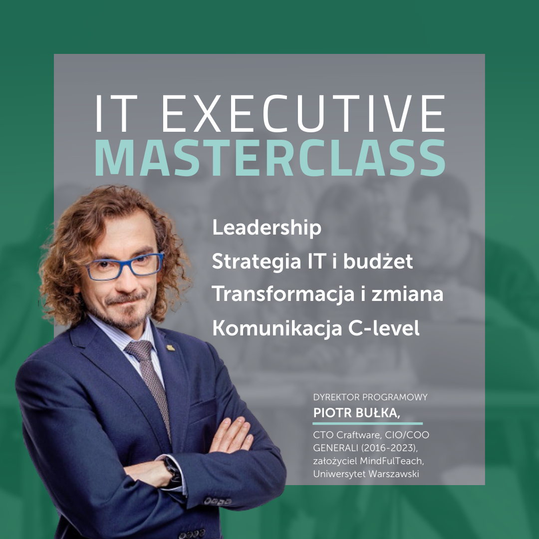 Oferta Executive Masterclass została zaprojektowana z myślą o różnorodnych potrzebach liderów IT. Niezależnie od tego, czy chcesz rozwijać swoje kompetencje liderskie, tworzyć strategie AI, czy pogłębiać współpracę z biznesem — znajdziesz program dopasowany do swoich celów i doświadczenia. Do wyboru są: IT Executive Masterclass, AI Executive Masterclass oraz Business Value Masterclass.